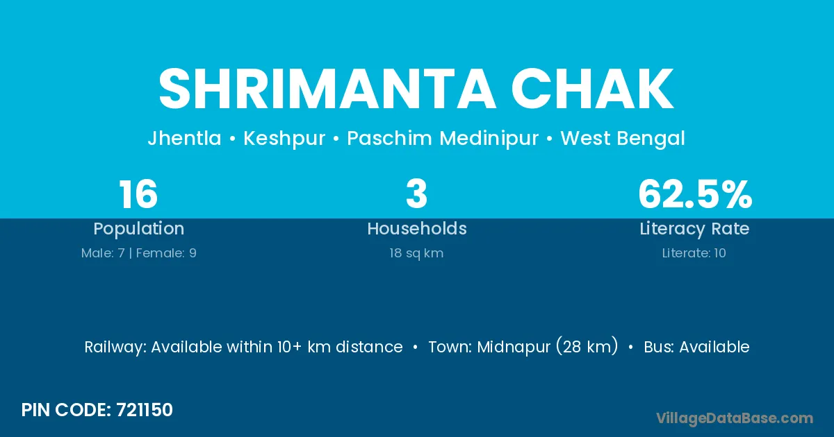 Midnapur (28 km) is the nearest town to Shrimanta Chak village for major economic activities and is located approximately 28 km away.