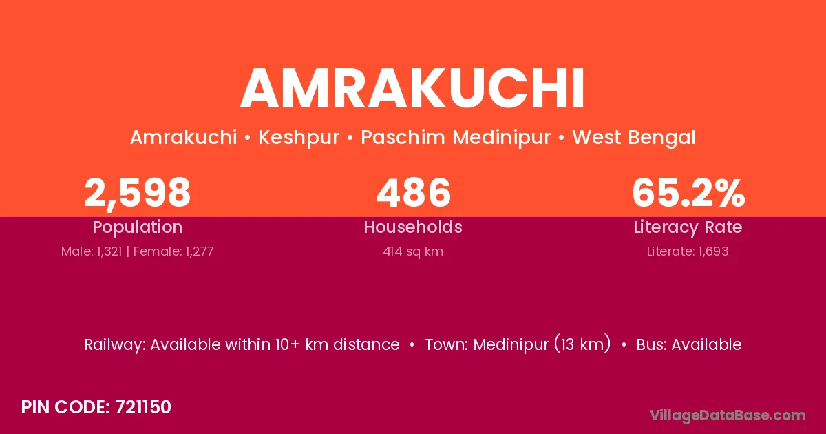 Medinipur (13 km) is the nearest town to Amrakuchi village for major economic activities and is located approximately 13 km away.