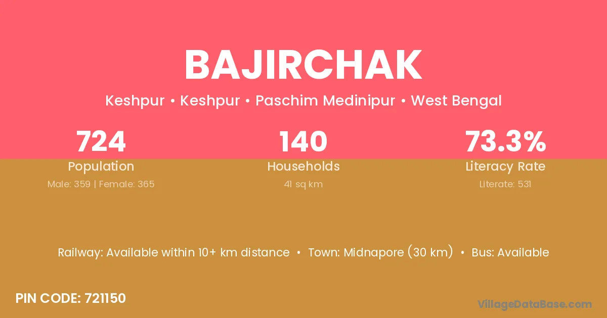 Midnapore (30 km) is the nearest town to Bajirchak village for major economic activities and is located approximately 30 km away.
