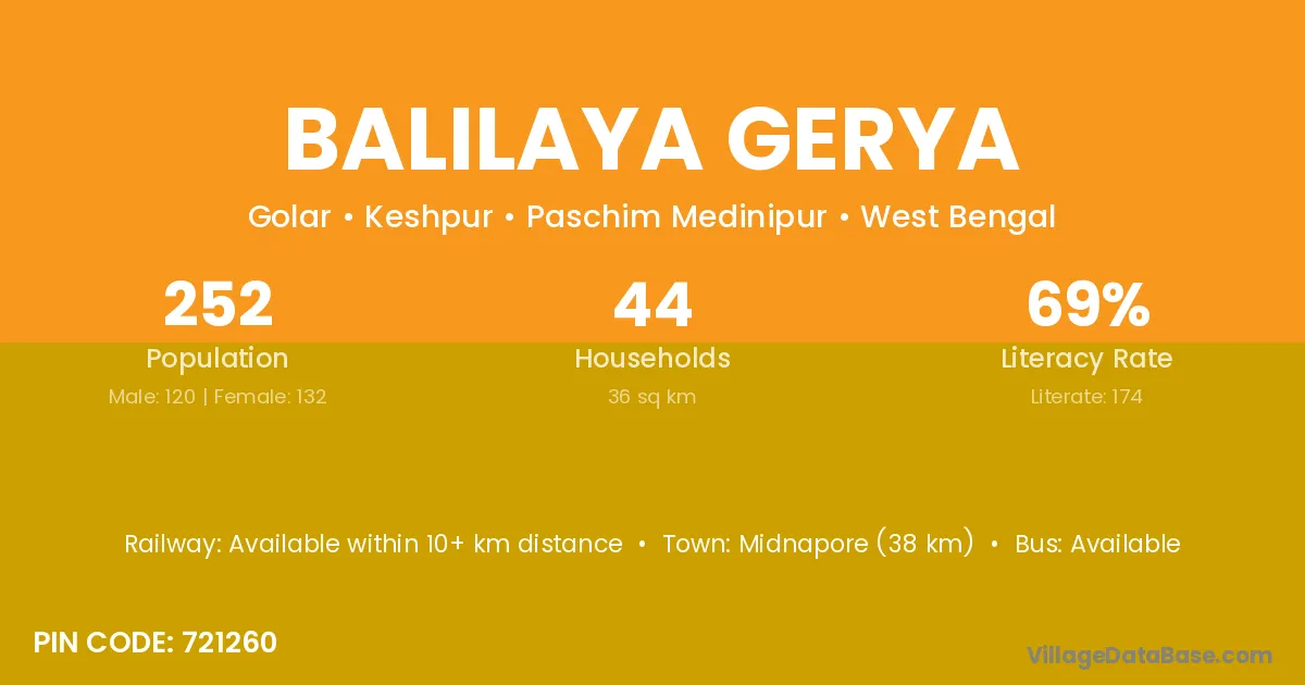 Midnapore (38 km) is the nearest town to Balilaya Gerya village for major economic activities and is located approximately 38 km away.