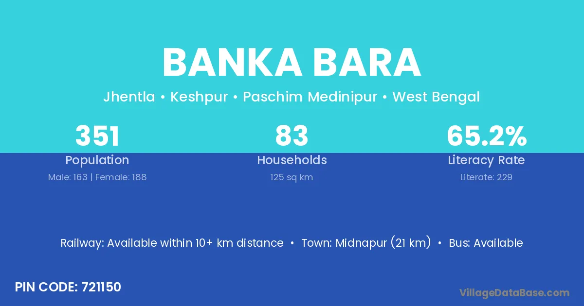 Midnapur (21 km) is the nearest town to Banka Bara village for major economic activities and is located approximately 21 km away.