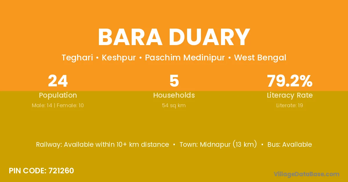 Midnapur (13 km) is the nearest town to Bara Duary village for major economic activities and is located approximately 13 km away.
