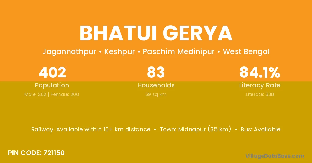 Midnapur (35 km) is the nearest town to Bhatui Gerya village for major economic activities and is located approximately 35 km away.