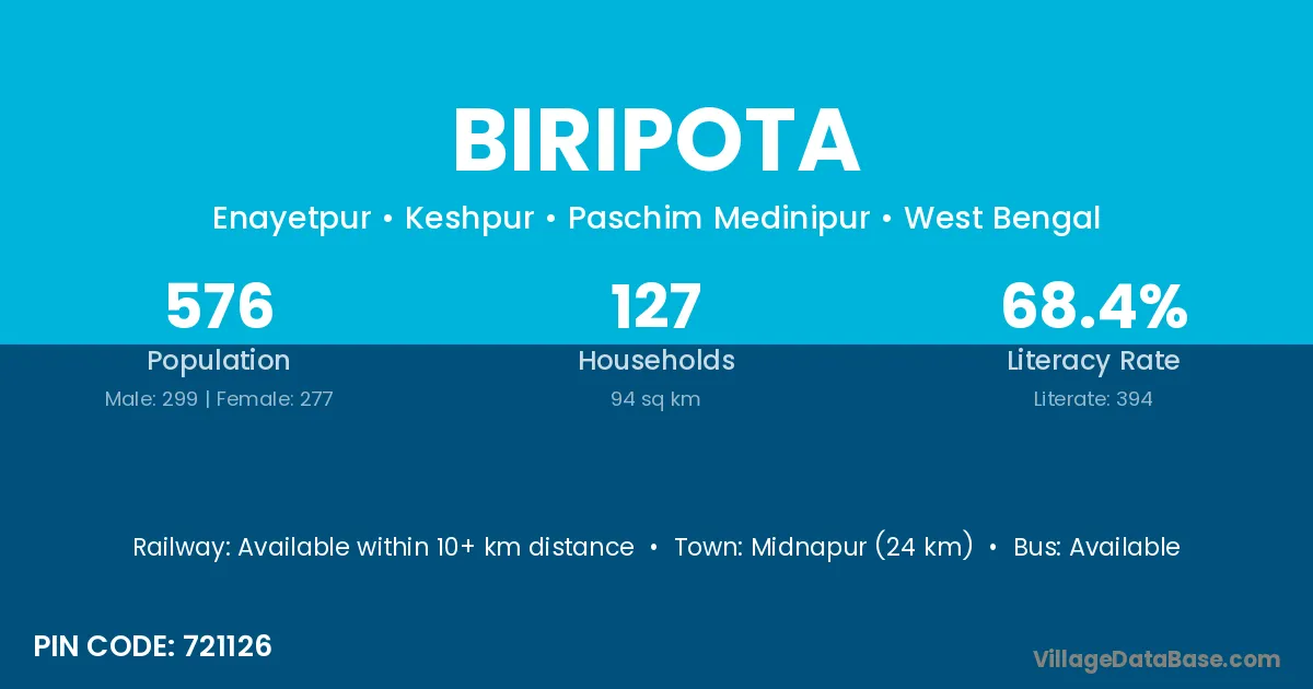 Midnapur (24 km) is the nearest town to Biripota village for major economic activities and is located approximately 24 km away.