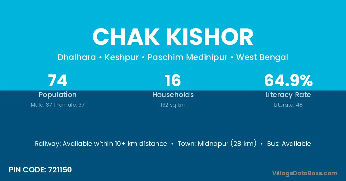 Midnapur (28 km) is the nearest town to Chak Kishor village for major economic activities and is located approximately 28 km away.