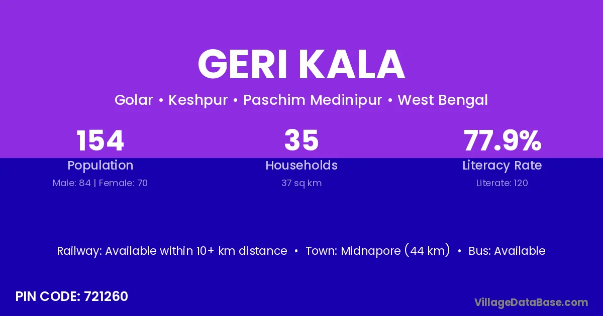 Midnapore (44 km) is the nearest town to Geri Kala village for major economic activities and is located approximately 44 km away.