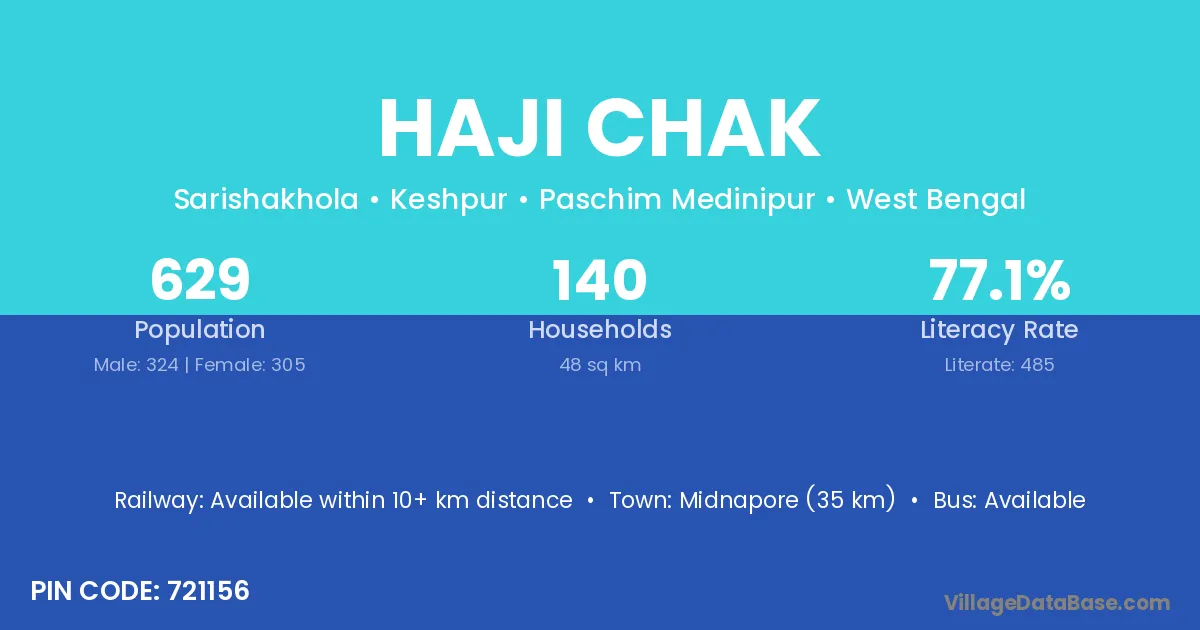 Midnapore (35 km) is the nearest town to Haji Chak village for major economic activities and is located approximately 35 km away.