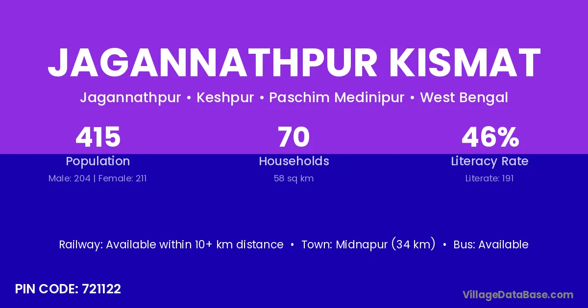 Midnapur (34 km) is the nearest town to Jagannathpur Kismat village for major economic activities and is located approximately 34 km away.