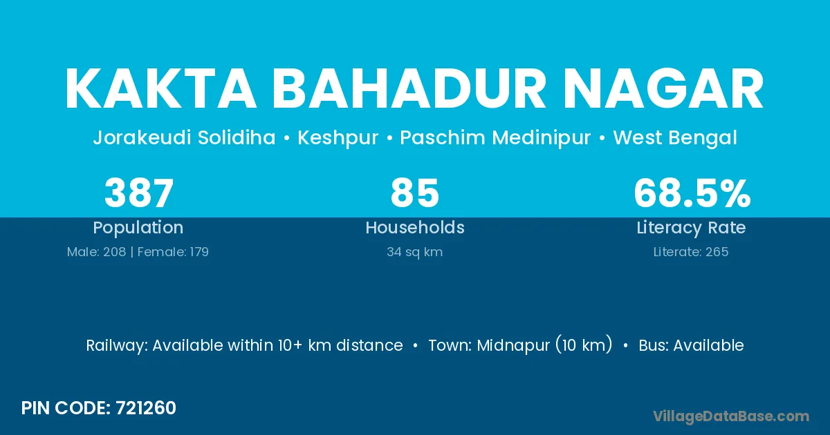 Midnapur (10 km) is the nearest town to Kakta Bahadur Nagar village for major economic activities and is located approximately 10 km away.