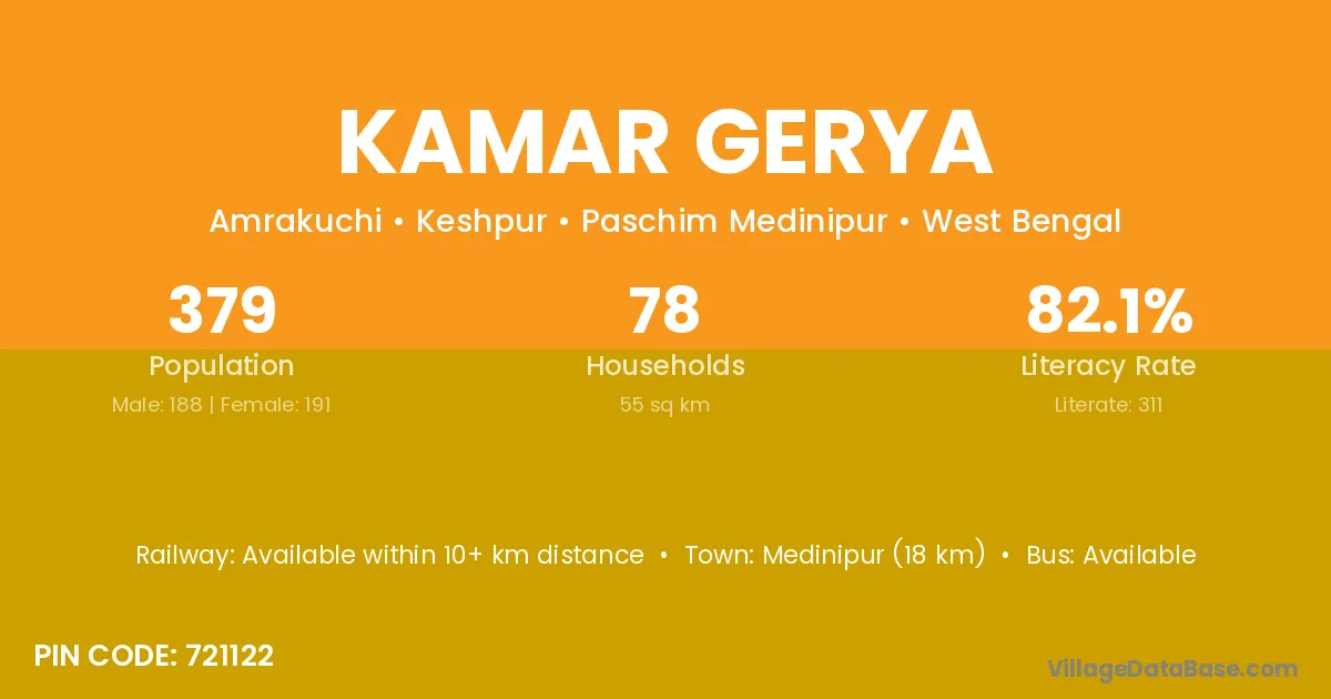 Medinipur (18 km) is the nearest town to Kamar Gerya village for major economic activities and is located approximately 18 km away.