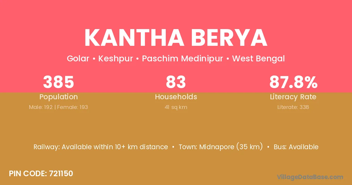 Midnapore (35 km) is the nearest town to Kantha Berya village for major economic activities and is located approximately 35 km away.