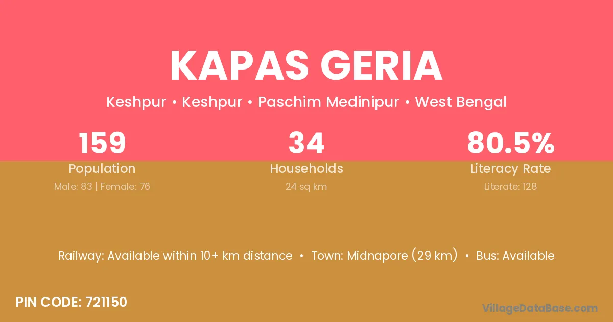 Midnapore (29 km) is the nearest town to Kapas Geria village for major economic activities and is located approximately 29 km away.