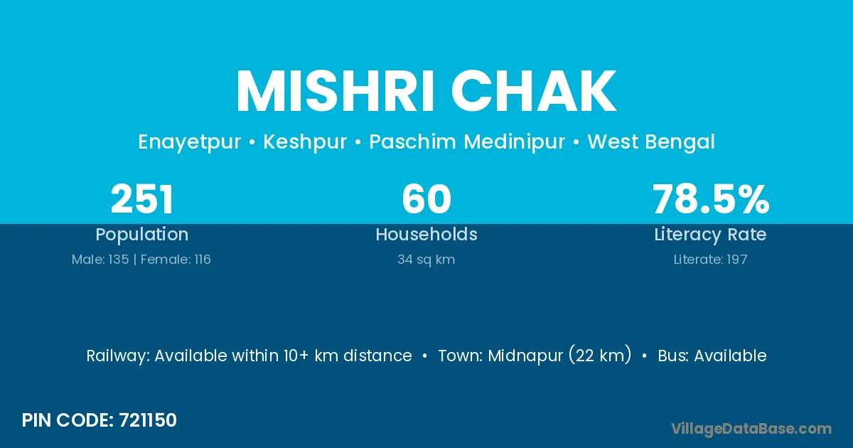 Midnapur (22 km) is the nearest town to Mishri Chak village for major economic activities and is located approximately 22 km away.
