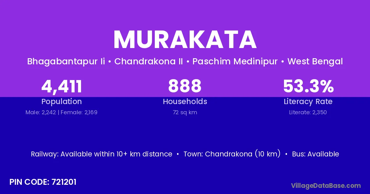 Chandrakona (10 km) is the nearest town to Murakata village for major economic activities and is located approximately 10 km away.