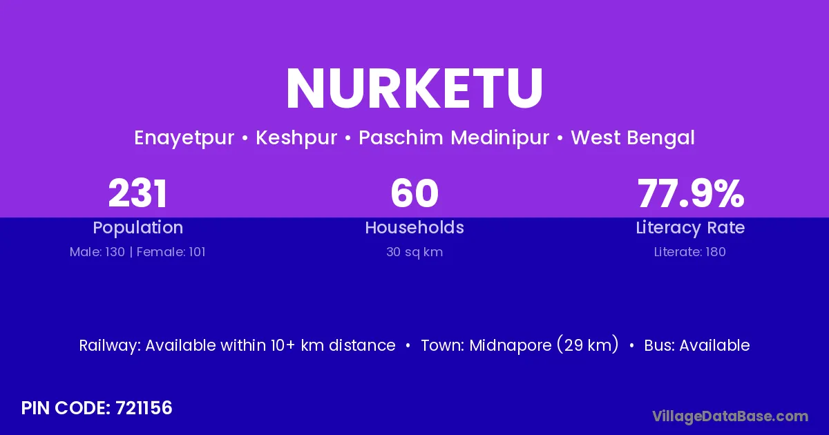 Midnapore (29 km) is the nearest town to Nurketu village for major economic activities and is located approximately 29 km away.
