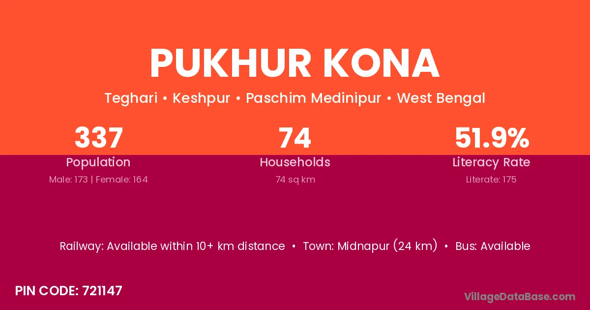 Midnapur (24 km) is the nearest town to Pukhur Kona village for major economic activities and is located approximately 24 km away.