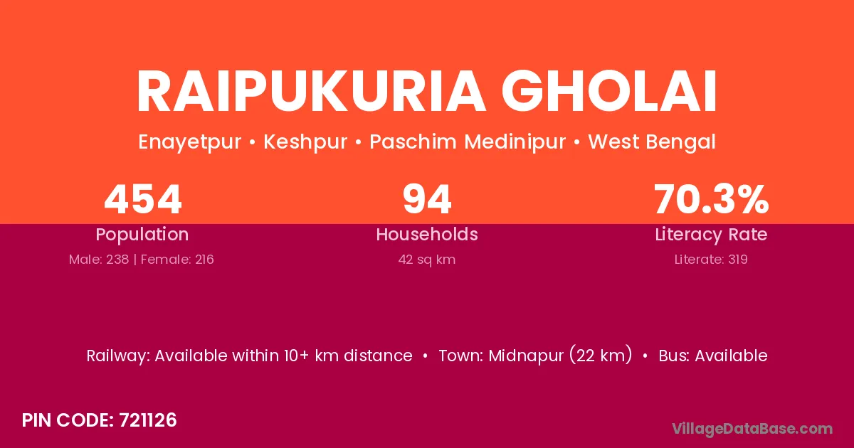 Midnapur (22 km) is the nearest town to Raipukuria Gholai village for major economic activities and is located approximately 22 km away.