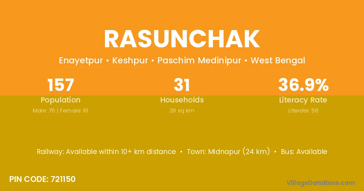 Midnapur (24 km) is the nearest town to Rasunchak village for major economic activities and is located approximately 24 km away.