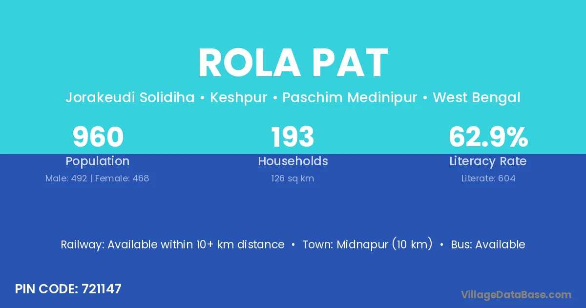 Midnapur (10 km) is the nearest town to Rola Pat village for major economic activities and is located approximately 10 km away.