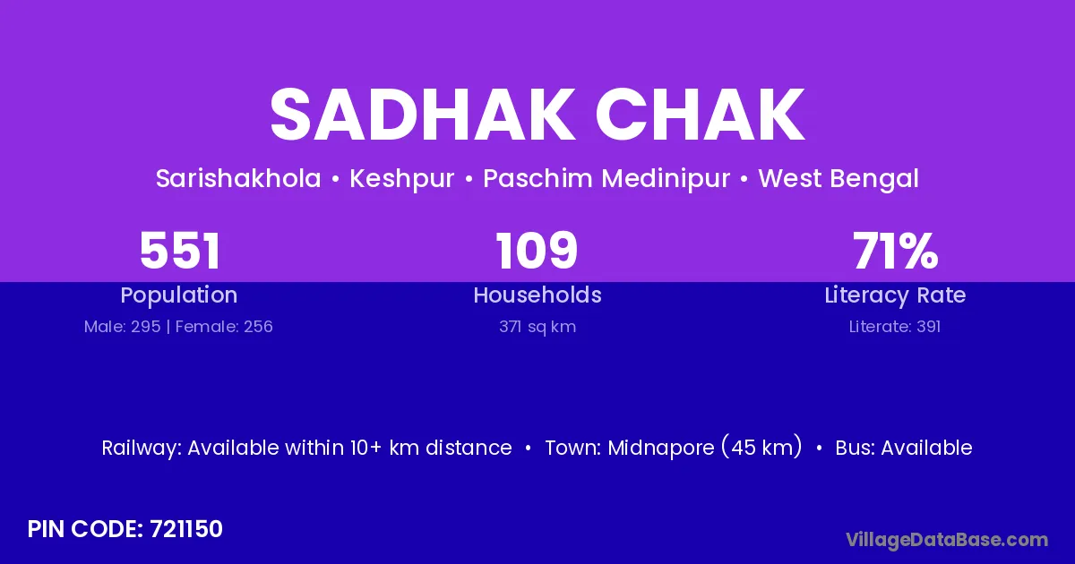 Midnapore (45 km) is the nearest town to Sadhak Chak village for major economic activities and is located approximately 45 km away.