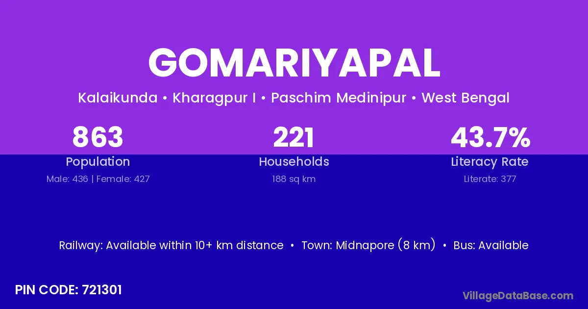 Midnapore (8 km) is the nearest town to Gomariyapal village for major economic activities and is located approximately 8 km away.