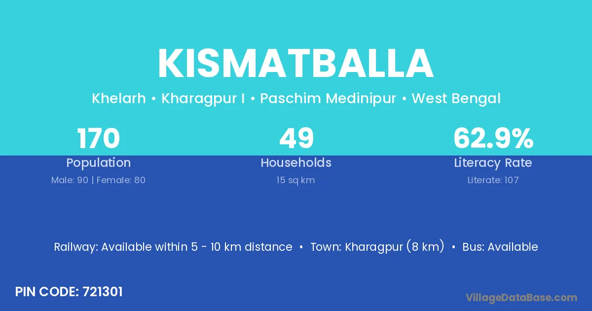 Kharagpur (8 km) is the nearest town to Kismatballa village for major economic activities and is located approximately 8 km away.
