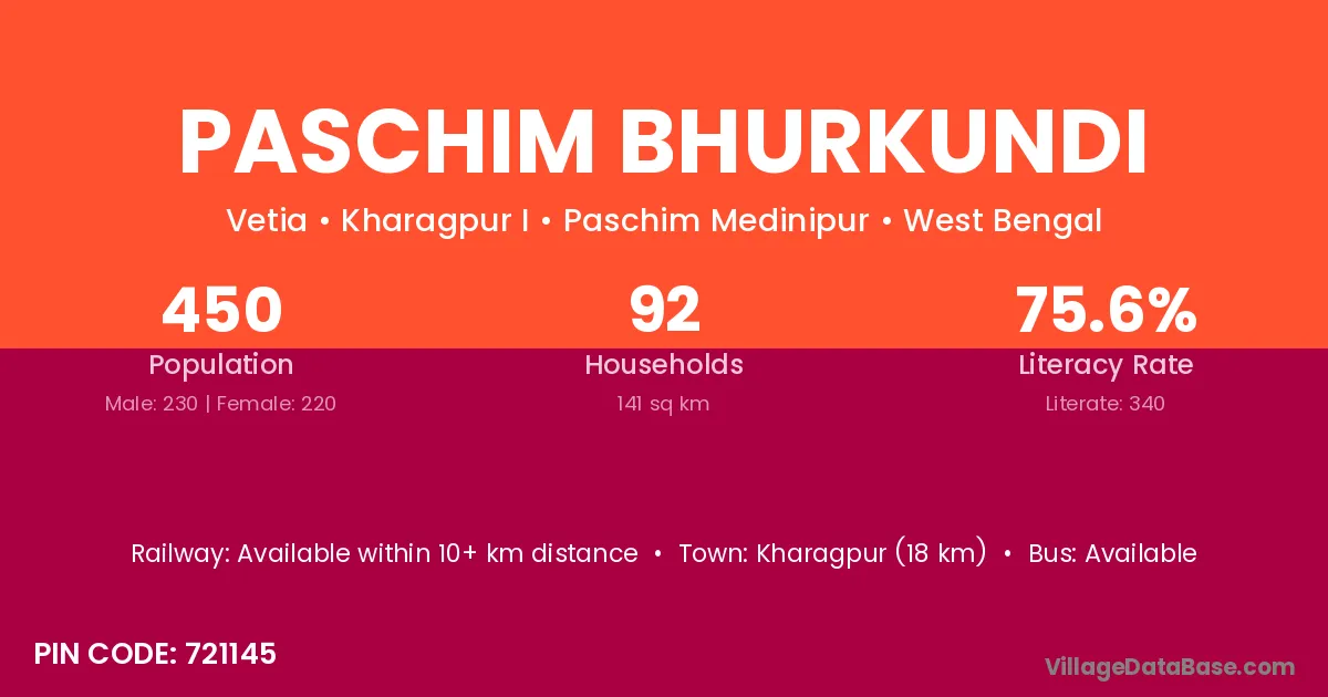 Kharagpur (18 km) is the nearest town to Paschim Bhurkundi village for major economic activities and is located approximately 18 km away.