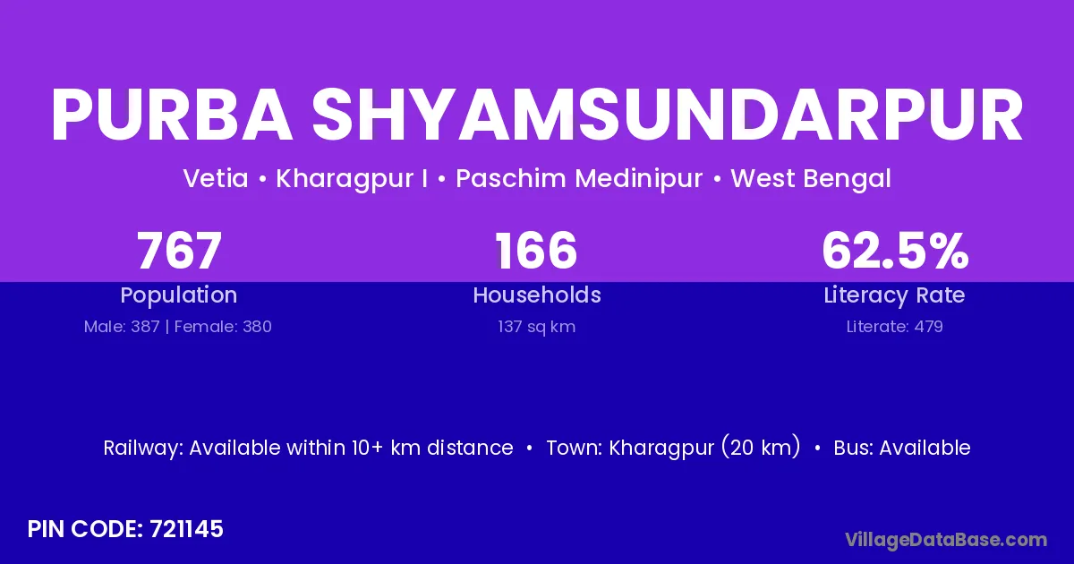 Kharagpur (20 km) is the nearest town to Purba Shyamsundarpur village for major economic activities and is located approximately 20 km away.