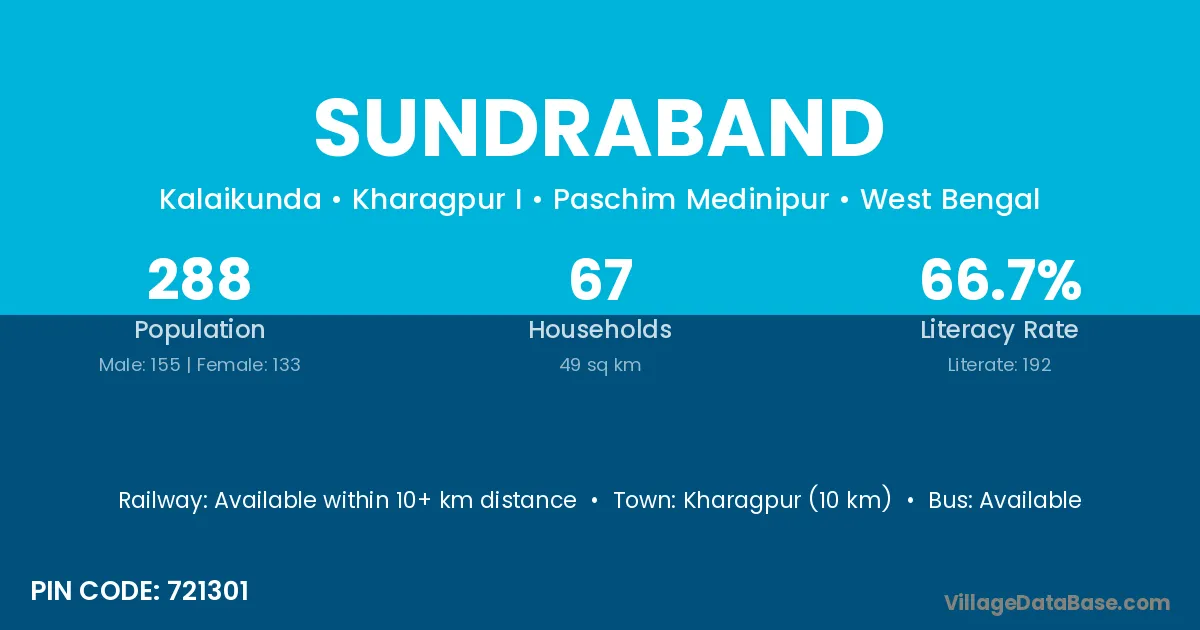 Kharagpur (10 km) is the nearest town to Sundraband village for major economic activities and is located approximately 10 km away.