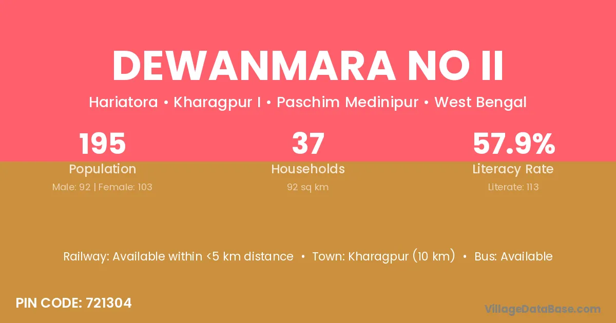 Kharagpur (10 km) is the nearest town to Dewanmara No Ii village for major economic activities and is located approximately 10 km away.