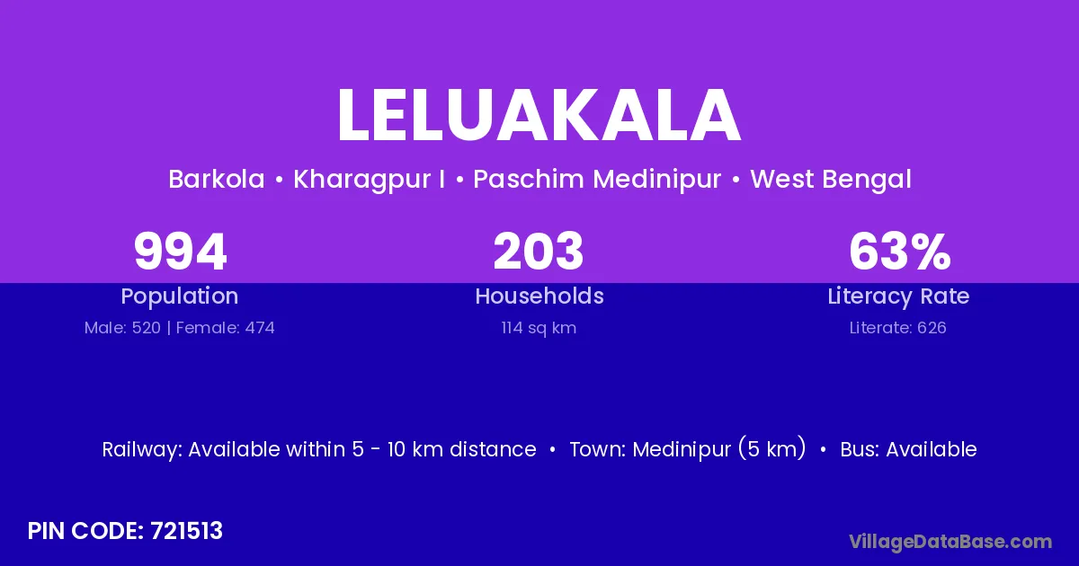 Medinipur (5 km) is the nearest town to Leluakala village for major economic activities and is located approximately 5 km away.