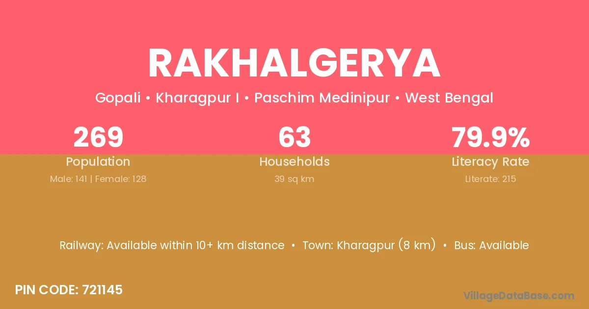 Kharagpur (8 km) is the nearest town to Rakhalgerya village for major economic activities and is located approximately 8 km away.