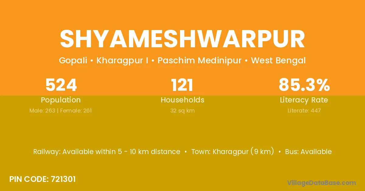 Kharagpur (9 km) is the nearest town to Shyameshwarpur village for major economic activities and is located approximately 9 km away.