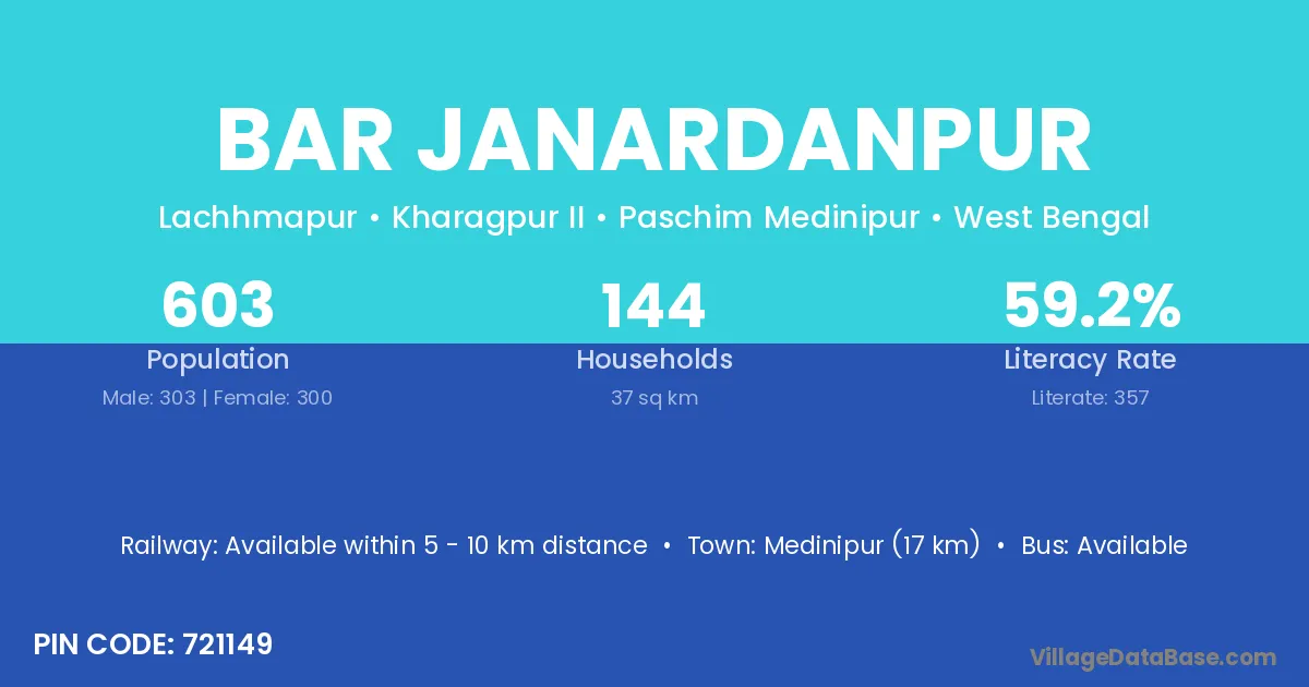 Medinipur (17 km) is the nearest town to Bar Janardanpur village for major economic activities and is located approximately 17 km away.