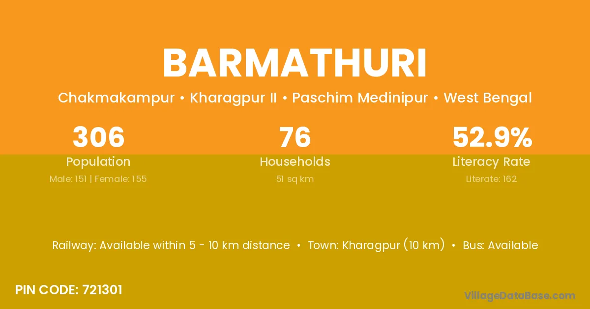 Kharagpur (10 km) is the nearest town to Barmathuri village for major economic activities and is located approximately 10 km away.