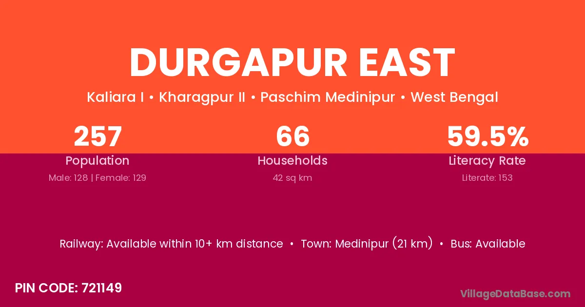 Medinipur (21 km) is the nearest town to Durgapur East village for major economic activities and is located approximately 21 km away.