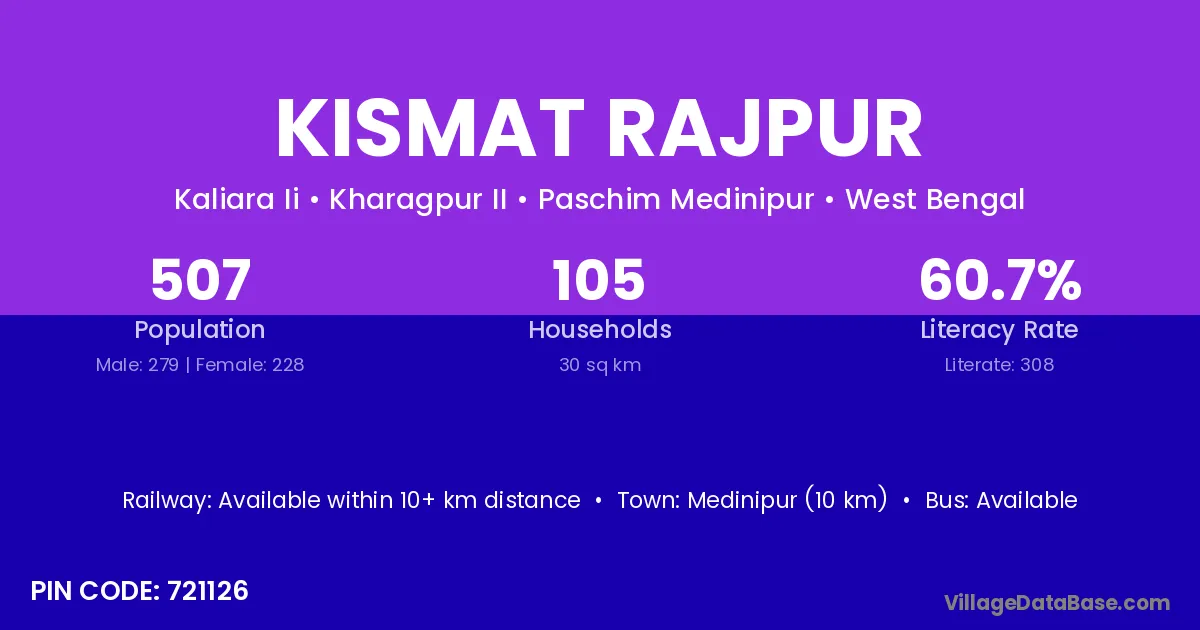 Medinipur (10 km) is the nearest town to Kismat Rajpur village for major economic activities and is located approximately 10 km away.
