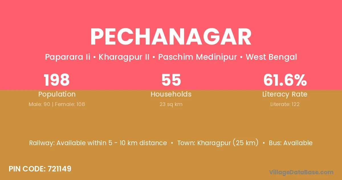Kharagpur (25 km) is the nearest town to Pechanagar village for major economic activities and is located approximately 25 km away.