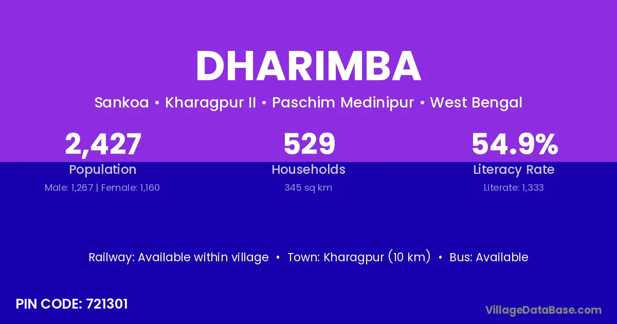 According to Census 2011 information, the village code of Dharimba village is 721301.