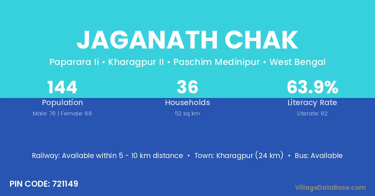 Kharagpur (24 km) is the nearest town to Jaganath Chak village for major economic activities and is located approximately 24 km away.