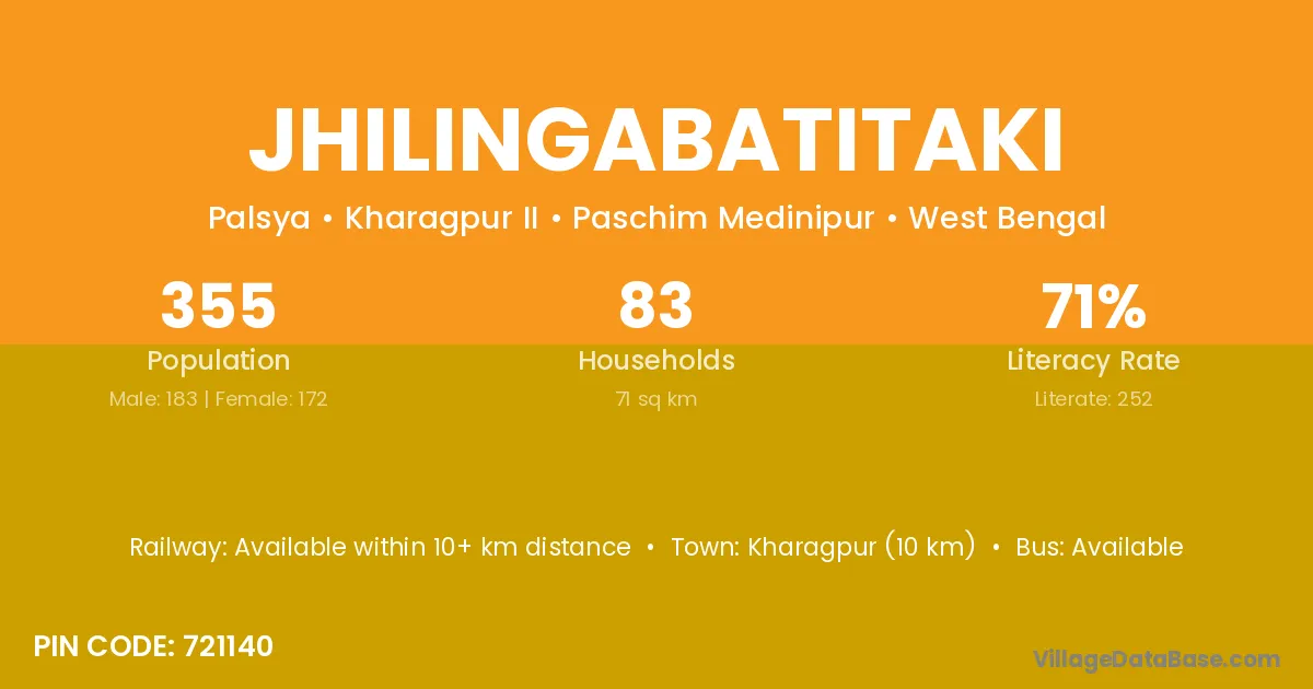 Kharagpur (10 km) is the nearest town to Jhilingabatitaki village for major economic activities and is located approximately 10 km away.