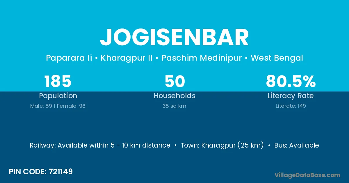 Kharagpur (25 km) is the nearest town to Jogisenbar village for major economic activities and is located approximately 25 km away.