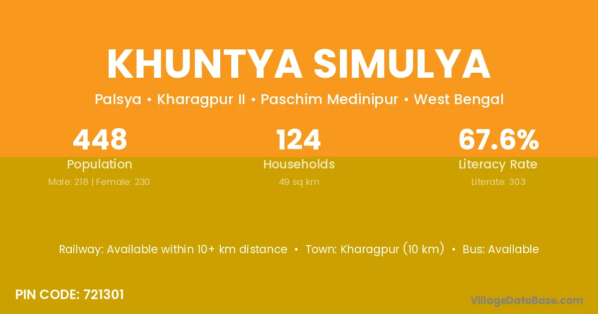 Kharagpur (10 km) is the nearest town to Khuntya Simulya village for major economic activities and is located approximately 10 km away.