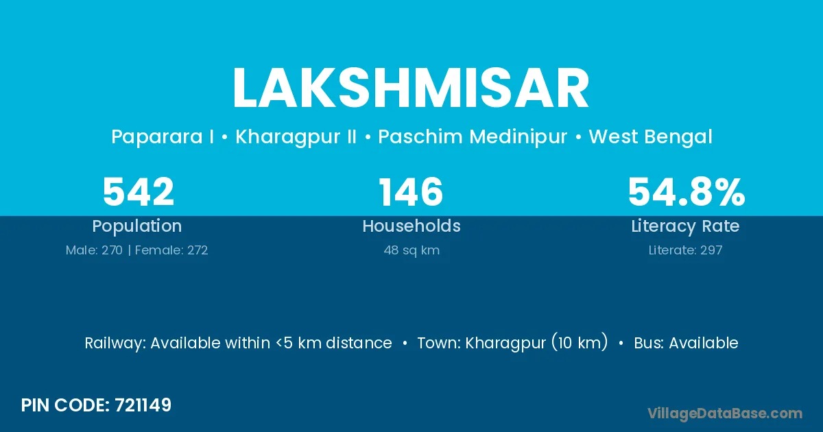 Kharagpur (10 km) is the nearest town to Lakshmisar village for major economic activities and is located approximately 10 km away.