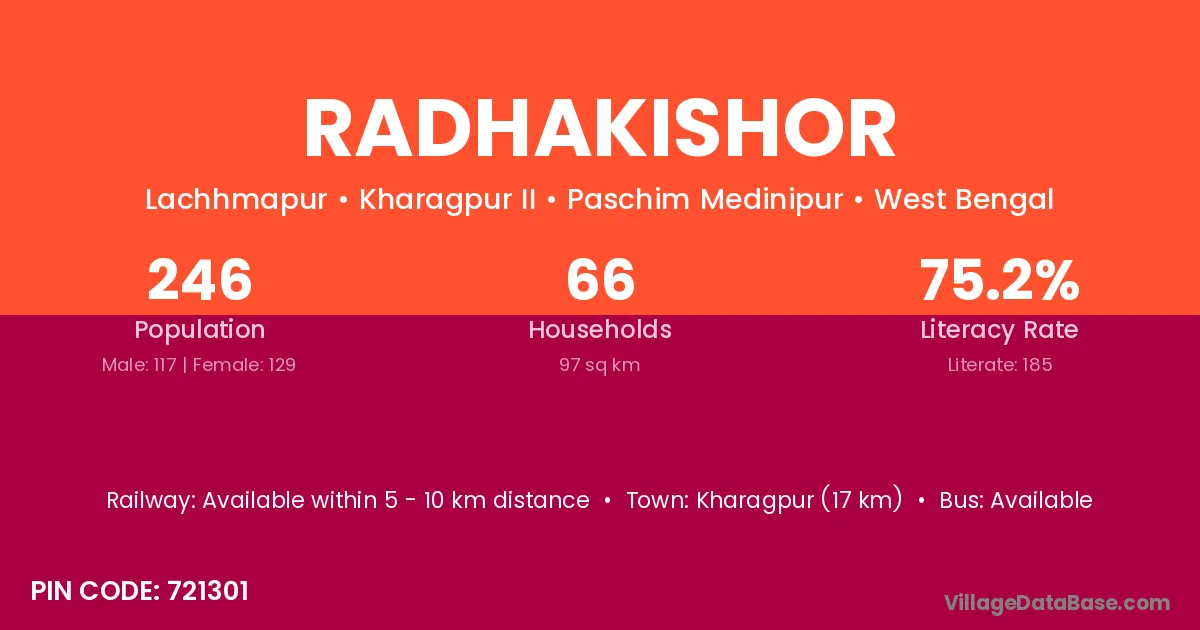 Kharagpur (17 km) is the nearest town to Radhakishor village for major economic activities and is located approximately 17 km away.