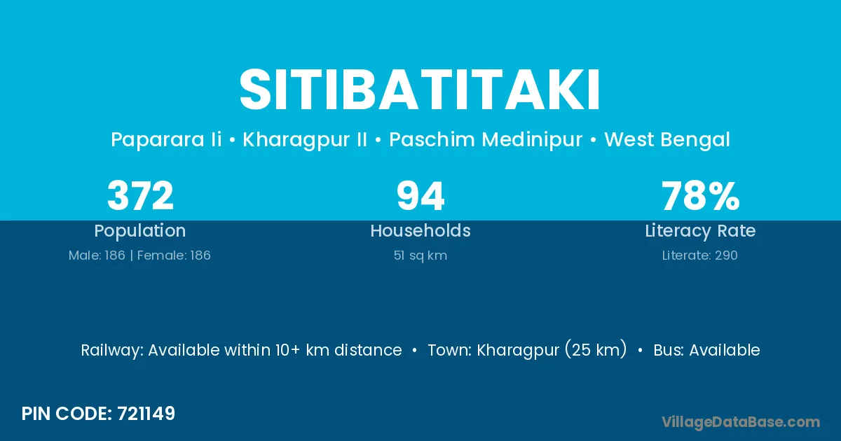 Kharagpur (25 km) is the nearest town to Sitibatitaki village for major economic activities and is located approximately 25 km away.