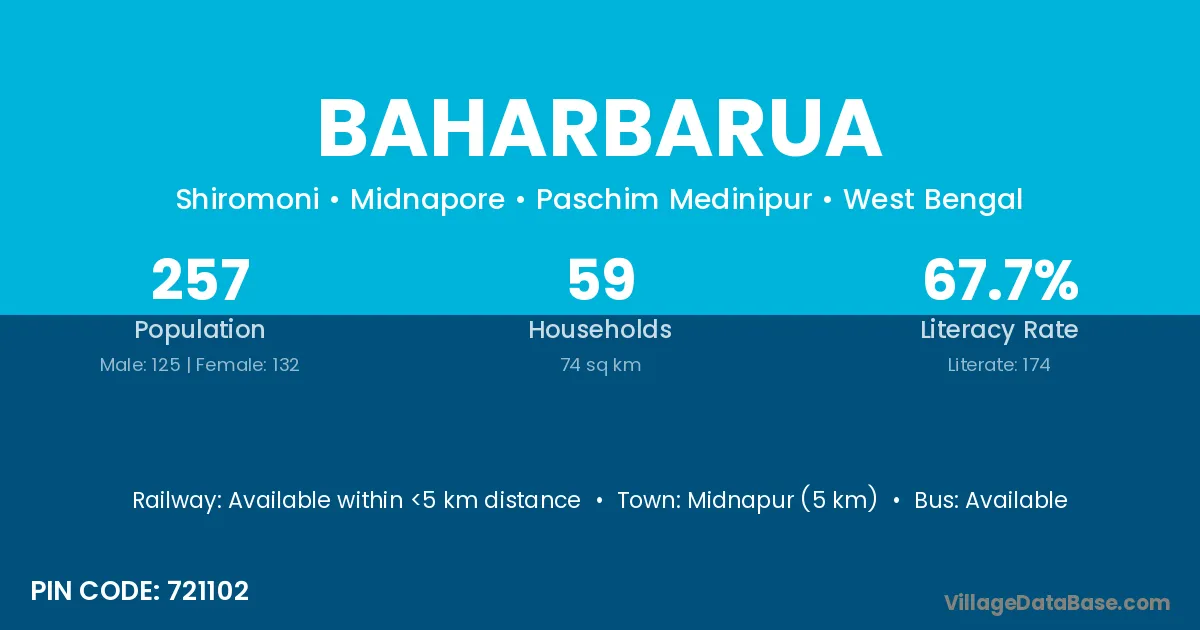 Midnapur (5 km) is the nearest town to Baharbarua village for major economic activities and is located approximately 5 km away.