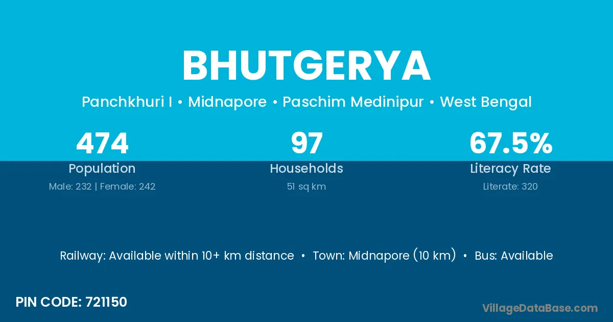 Midnapore (10 km) is the nearest town to Bhutgerya village for major economic activities and is located approximately 10 km away.