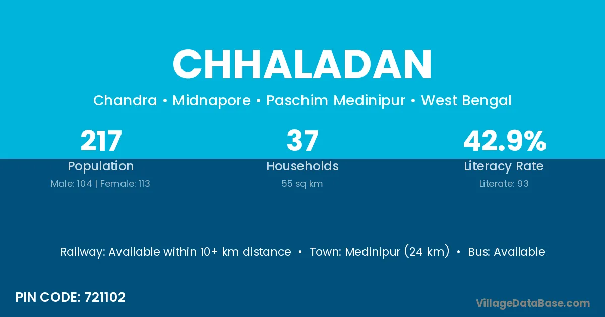 Medinipur (24 km) is the nearest town to Chhaladan village for major economic activities and is located approximately 24 km away.