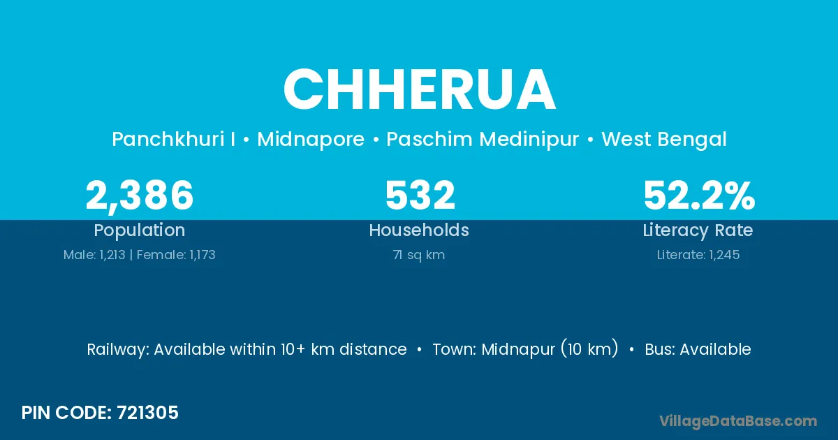 Midnapur (10 km) is the nearest town to Chherua village for major economic activities and is located approximately 10 km away.